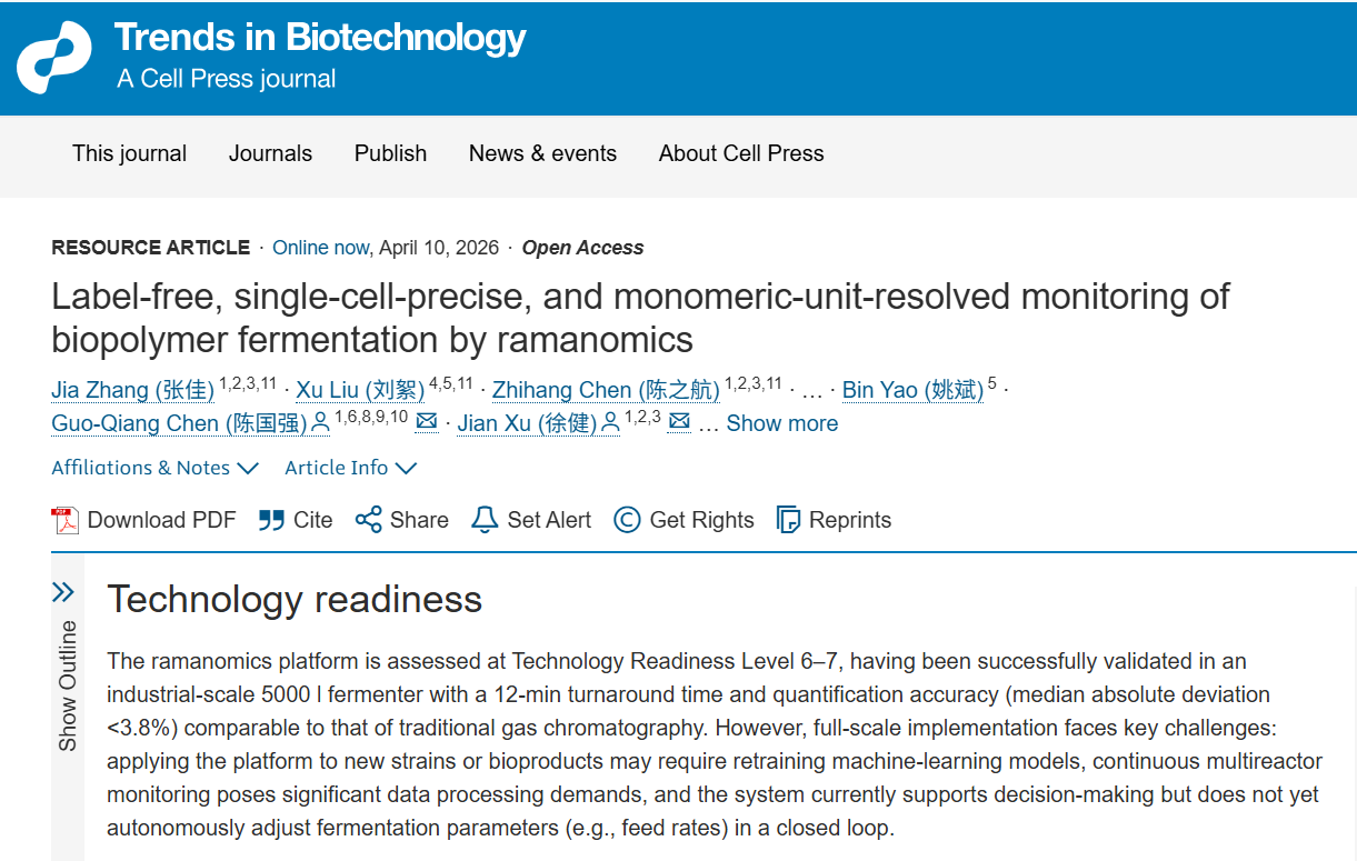 4月21日,科技日报记者从中国科学院青岛生物能源与过程研究所(以下简称“青岛能源所”)获悉,该所单细胞中心联合清华大学、中国农业科学院等单位,创新性地将过程拉曼组技术引入发酵过程监控。该方法犹如装上一双“透视眼”,能即时监测工业发酵罐内细胞代谢功能的变化,快速获取单细胞精度的多项关键指标。相关研究近日发表在国际学术期刊《生物技术趋势》上。