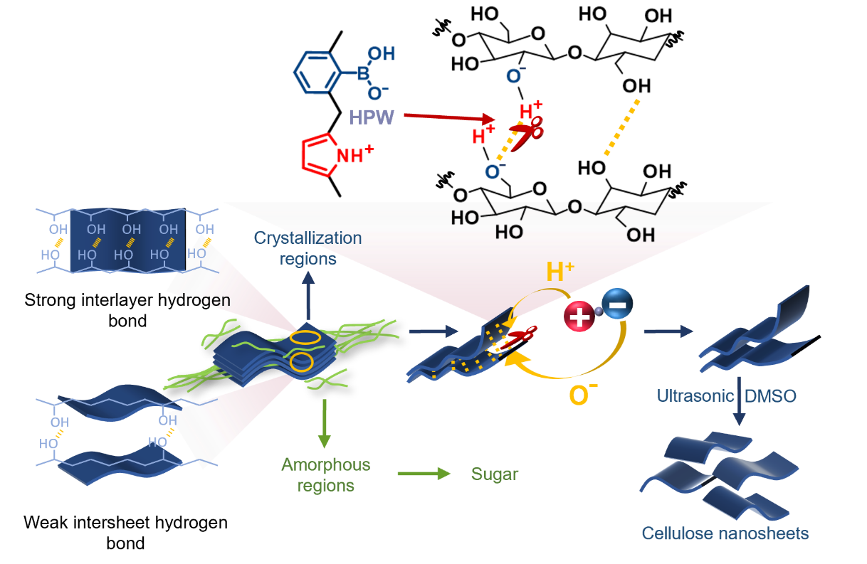 基于这一发现,中国科学院宁波材料技术与工程研究所研究员那海宁提出了“两性离子复合固体催化剂构建及纤维素选择性催化解聚”策略。研究人员采用强制性共价连接模式,设计合成了新型固体催化剂。简单来说,就像是打造了一把“精准剪刀”:它把弱酸性与弱碱性单元均匀分散排列,通过调控二者相互作用获得适宜的离子强度,再加上磷钨酸的辅助,形成一种全新的解聚技术。用这把“剪刀”解离纤维素,就像在特定层面上温和地“剪开”聚集结构,既不会破坏纤维素本身的分子结构,又能完整把二维片状纳米材料提取出来。