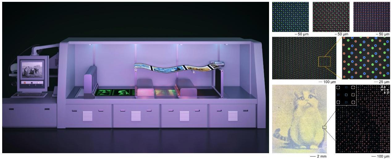 此次,科研人员设计了一种由纳米晶格堆叠而成的微米半球单元,通过调整晶格排列,就能让单个像素点变幻出不同颜色。更关键的是,他们自主研发的卷对卷增材打印设备,能用低成本的聚合物材料,通过柔性基材滚筒输送、连续打印成型工艺,在纳米精度下快速制备跨尺度光学超材料,还能为每个像素单独定制光学性能,一举解决低成本、规模化、个性化量产难以兼顾的世界性难题。