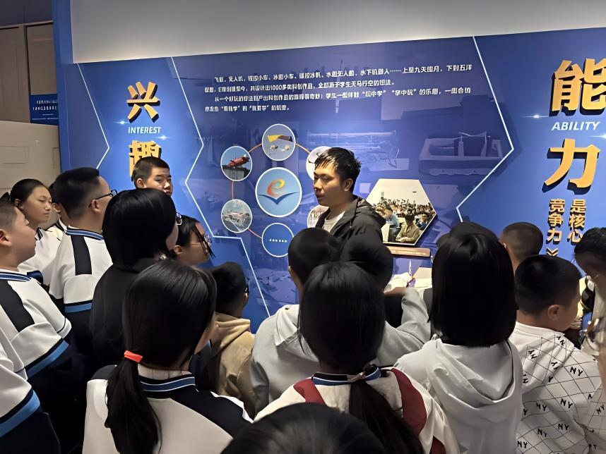 在哈工程E唯冠军展廊,同学们认真聆听学长学姐们在国际大赛前夜连夜抢修机器人、绝地反击的真实故事。从意外故障到逆境夺冠,孩子们既紧张又振奋。