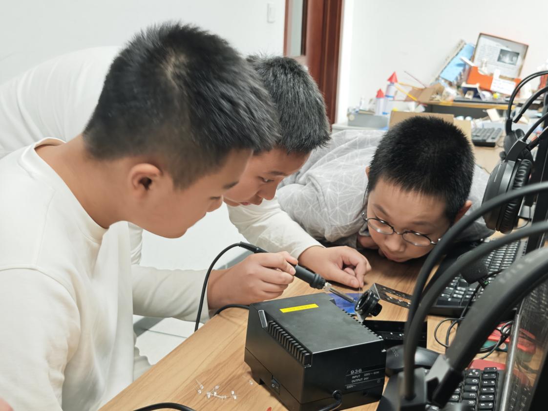 这是哈工程E唯科创团队指导教师李海波为初一学生上水下机器人芯片焊接课的一幕。