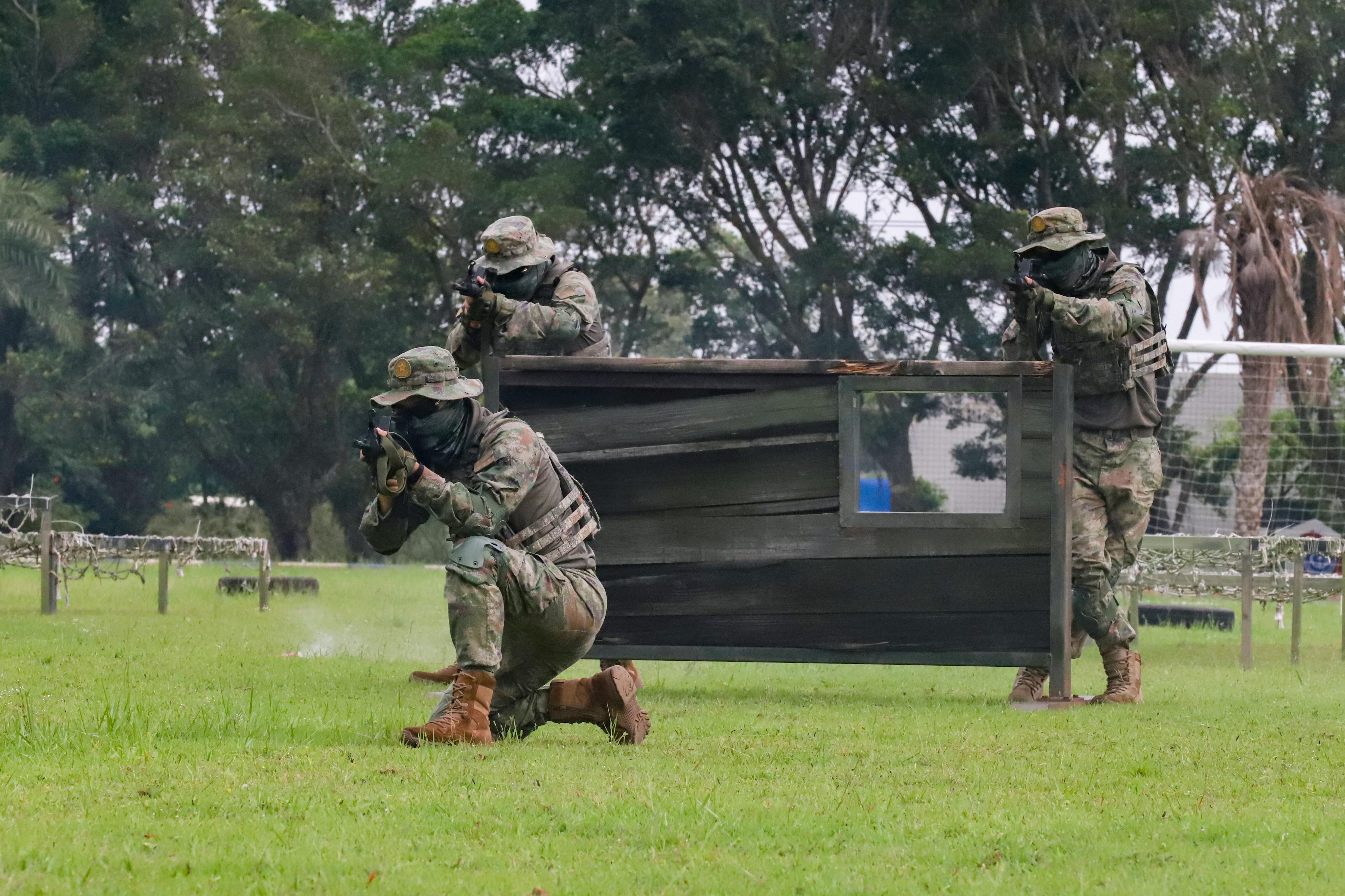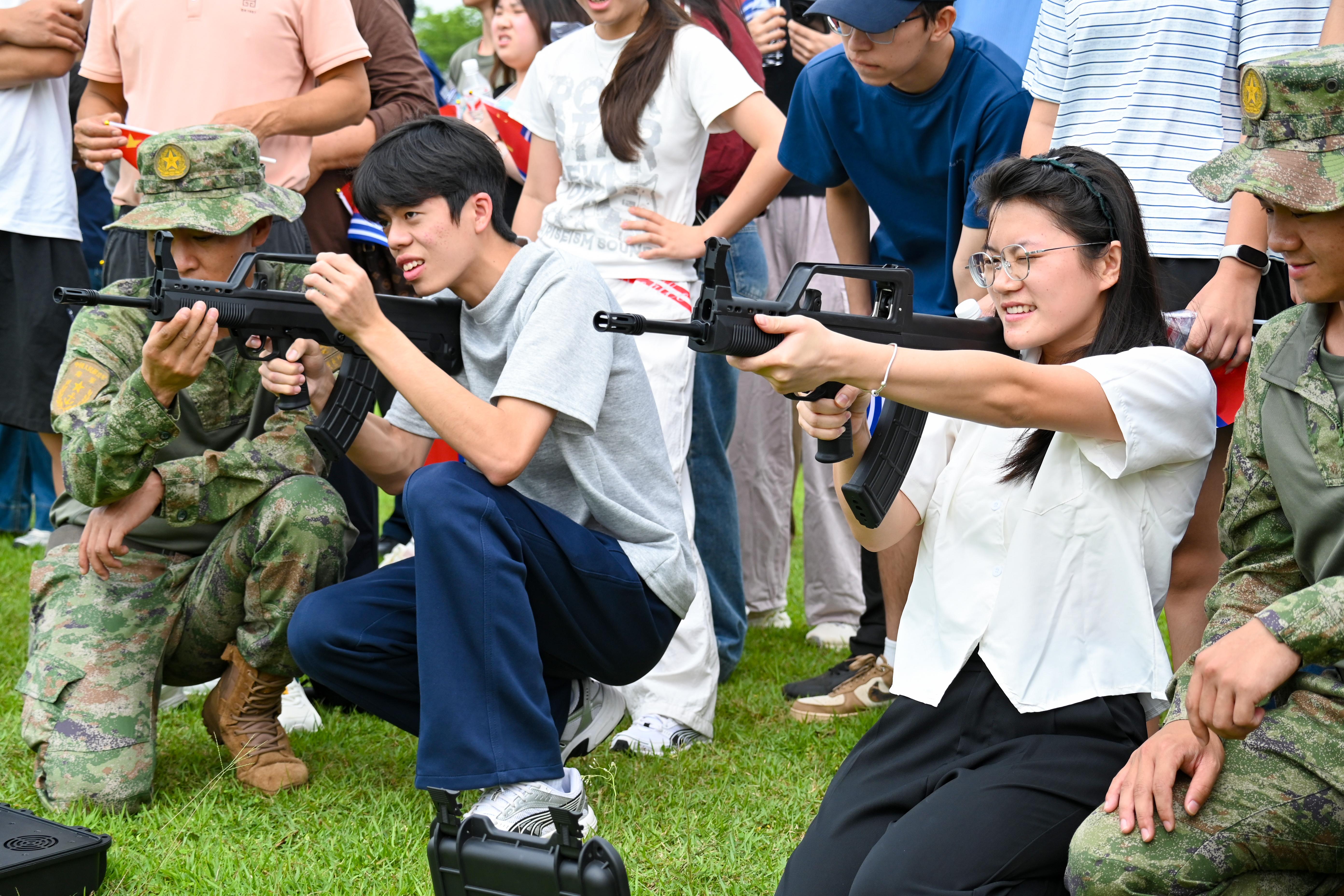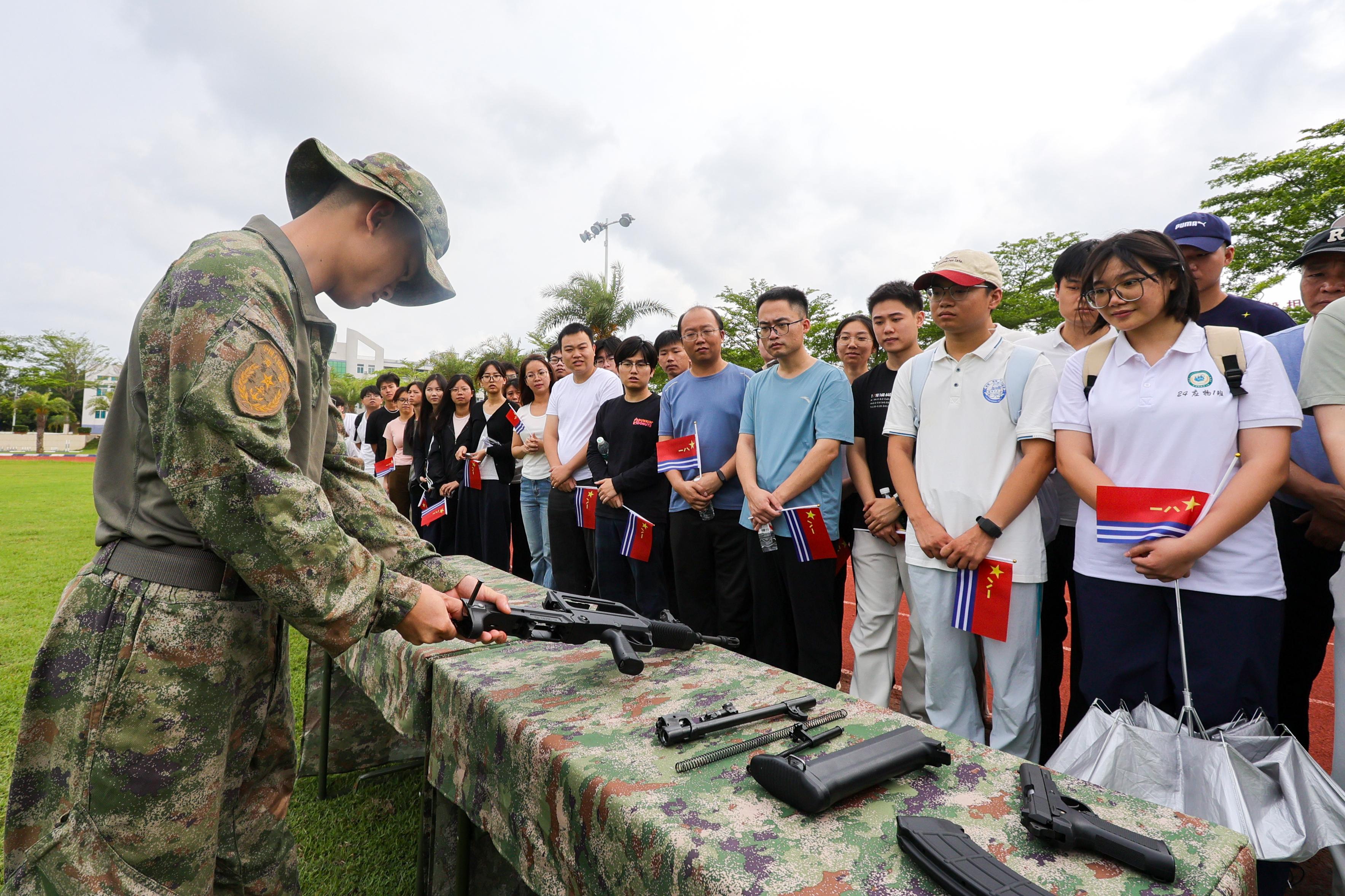 随后,师生们来到训练场,一场精彩纷呈的军事技能展示拉开帷幕。刺杀操动作刚劲有力,吼声震天,彰显出官兵“一不怕苦、二不怕死”的战斗精神;战术动作演示干净利落,翻滚、匍匐、跃进一气呵成,赢得现场师生阵阵掌声。在枪械体验区,官兵现场演示自动步枪的拆解与组装,师生们在专业指导下亲手触摸枪械、试戴头盔、模拟射击,在体验中感受军营硬核魅力,加深对人民军队的理解与认同。