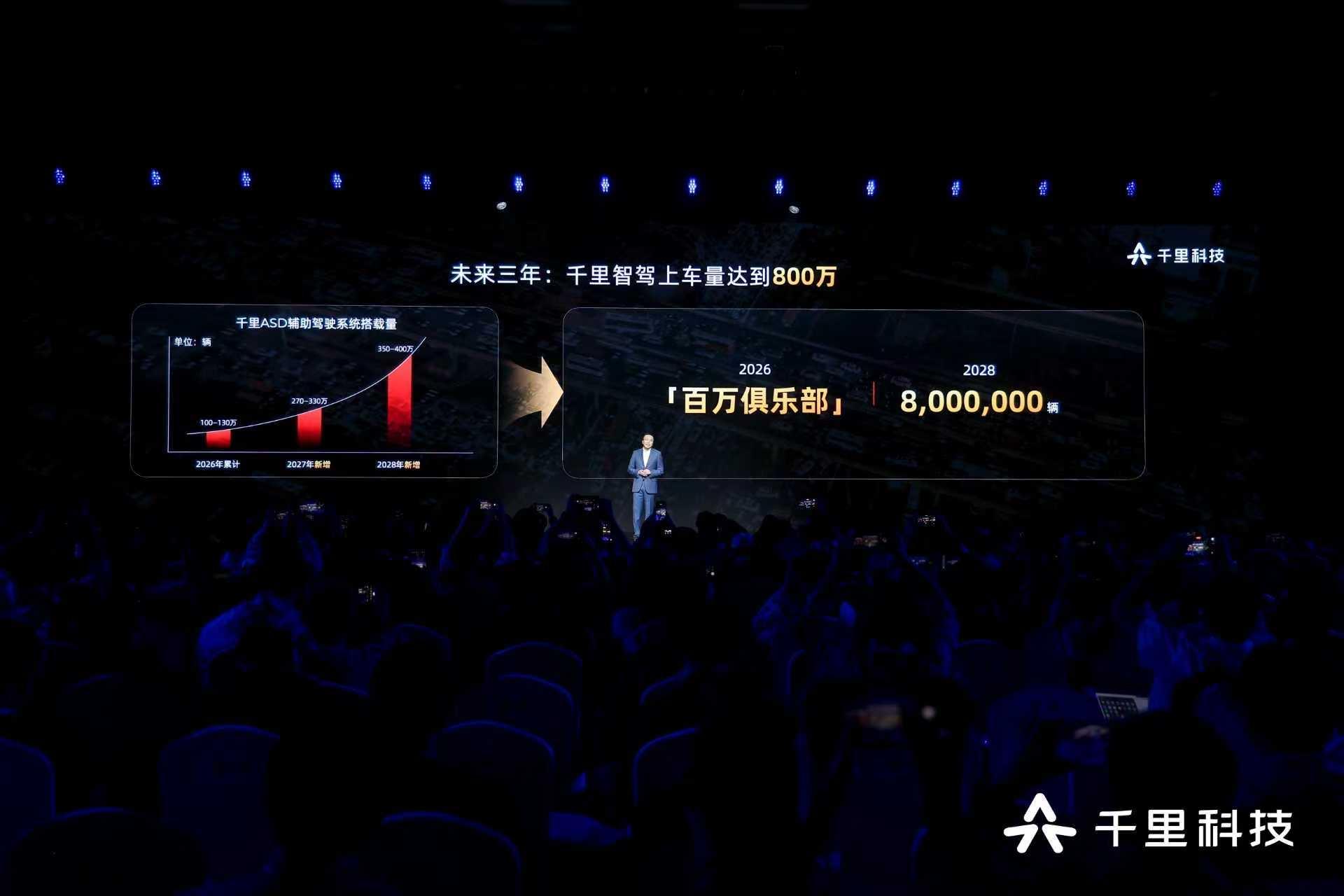 赵明在演讲中分析,AI投入巨大,商业闭环是行业难题,“AI+车”是目前AI技术走向商业化的第一入口。数据显示,截至今年3月31日,已有17款车型、合计46万辆车搭载了千里科技的智驾技术,辅助驾驶激活率高达92%。赵明给出了激进的预测:2026年底搭载量将突破百万,2028年挑战800万辆,届时千里科技有望成为全球最大的智驾方案供应商之一。