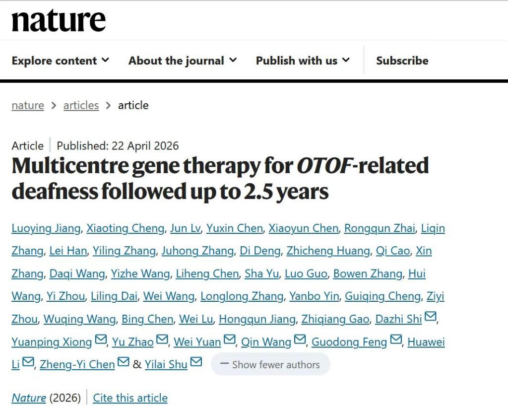 我国科学家在先天性耳聋基因治疗领域取得重大突破性进展。复旦大学附属眼耳鼻喉科医院舒易来、李华伟团队领衔的多中心临床研究证实,针对OTOF(耳畸蛋白)基因突变导致的先天性重度至极重度耳聋,基因治疗安全有效,超九成患者听力恢复,最长疗效已持续两年半。相关成果于4月22日在线发表于国际顶级期刊《自然》。