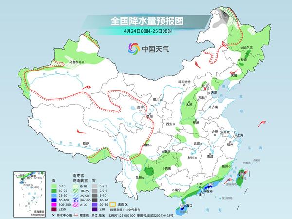 具体来看,中央气象台预计,今天,内蒙古东北部、黑龙江西北部、新疆沿天山地区等地部分地区有小到中雪或雨夹雪,其中,黑龙江西北部等地部分地区有大雪;黑龙江东南部、吉林中部、云南东北部、华南南部、海南岛、台湾岛等地部分地区有中雨,广东中南部沿海、海南岛大部、台湾岛西部等地部分地区有大雨,其中,广东东南部沿海、海南岛中部局地有暴雨。