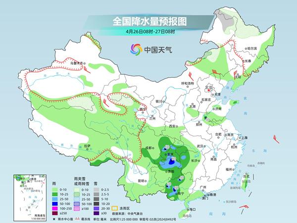 后天,内蒙古东北部、黑龙江西北部、青海北部、甘肃祁连山等地部分地区有小雪或雨夹雪;西南地区东部、湖北西南部、湖南西部、广西中西部、山东西南部等地部分地区有中到大雨,其中,广西中部、贵州东北部、四川东部等地部分地区有暴雨。