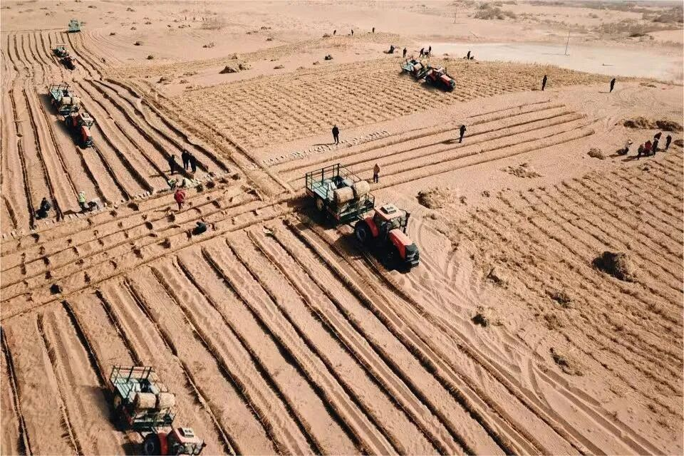 在阿拉善盟,铺设沙障是防风固沙的基础,但人工铺设工序繁多,劳动强度大,每人每天只能铺设400—600米,而且难以保证沙障规格一致,影响固沙效果。针对这一问题,蒙草研究团队研发创新机械,取得实用新型专利《固沙机》,每日沙障铺设量达3万米,近50亩,只需两人操作。铺设的沙障规格统一、质量稳定、抗风效果更好,极大降低劳动强度,避免大量人员在风沙艰苦环境中作业。在浑善达克沙地、乌兰布和沙漠等沙区应用效果良好。