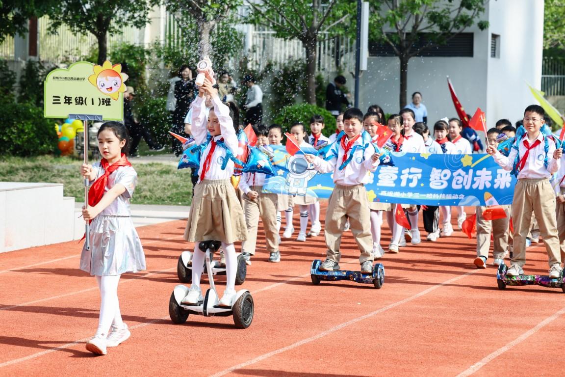 当天上午,伴随着激昂的音乐,活动正式拉开帷幕。入场式以“穿越时空的科技之旅”为主题,各年级演绎科技演进历程。一年级以“古代文明”为主线,手持火药、司南、字模与纸鸢,致敬中华智慧;二年级以“交通变迁”为脉络,从绿皮火车到复兴高铁,生动演绎“中国速度”;三年级化身“小小太空人”,平衡车与飞行器交织出探索星辰大海的画卷。