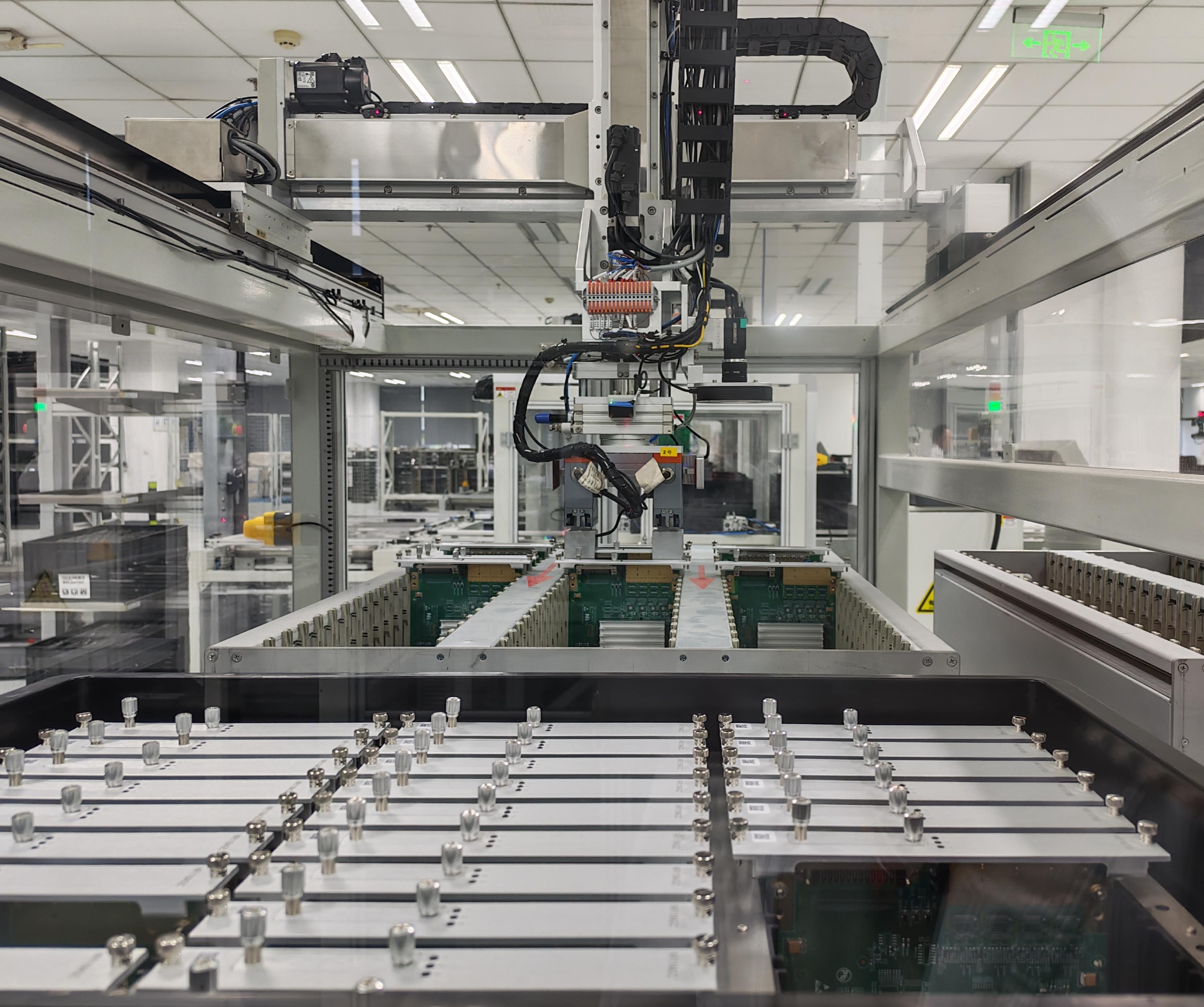 相比一楼,这里更加繁忙。10台近2米高的料箱机器人先是将板卡从立体板卡库取出运输到自动分拣台,再按照生产订单,将同一个订单需要的不同类型的板卡,拣选到同一个料箱,由AGV配送到后端装配。