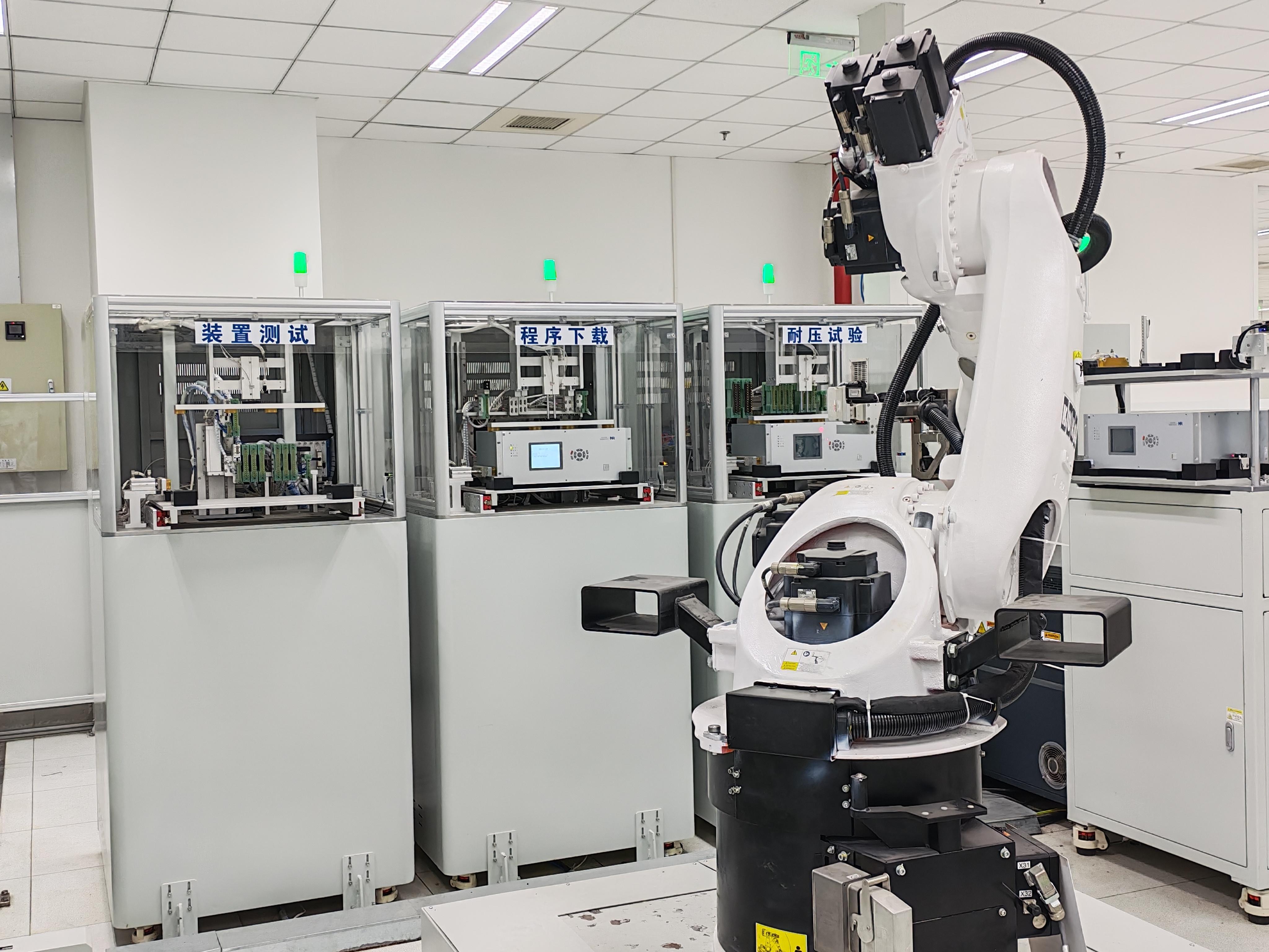 在装配线的背后,另一台机器人抓起装备好的电力装置,把它们送入一个个检测仓,进行耐压测试、程序下载和装置检测。史青华介绍,“程序下载指的是将我们编写的运行软件,通过5G网络,从服务器传到装置里,让装置获得‘大脑’。”