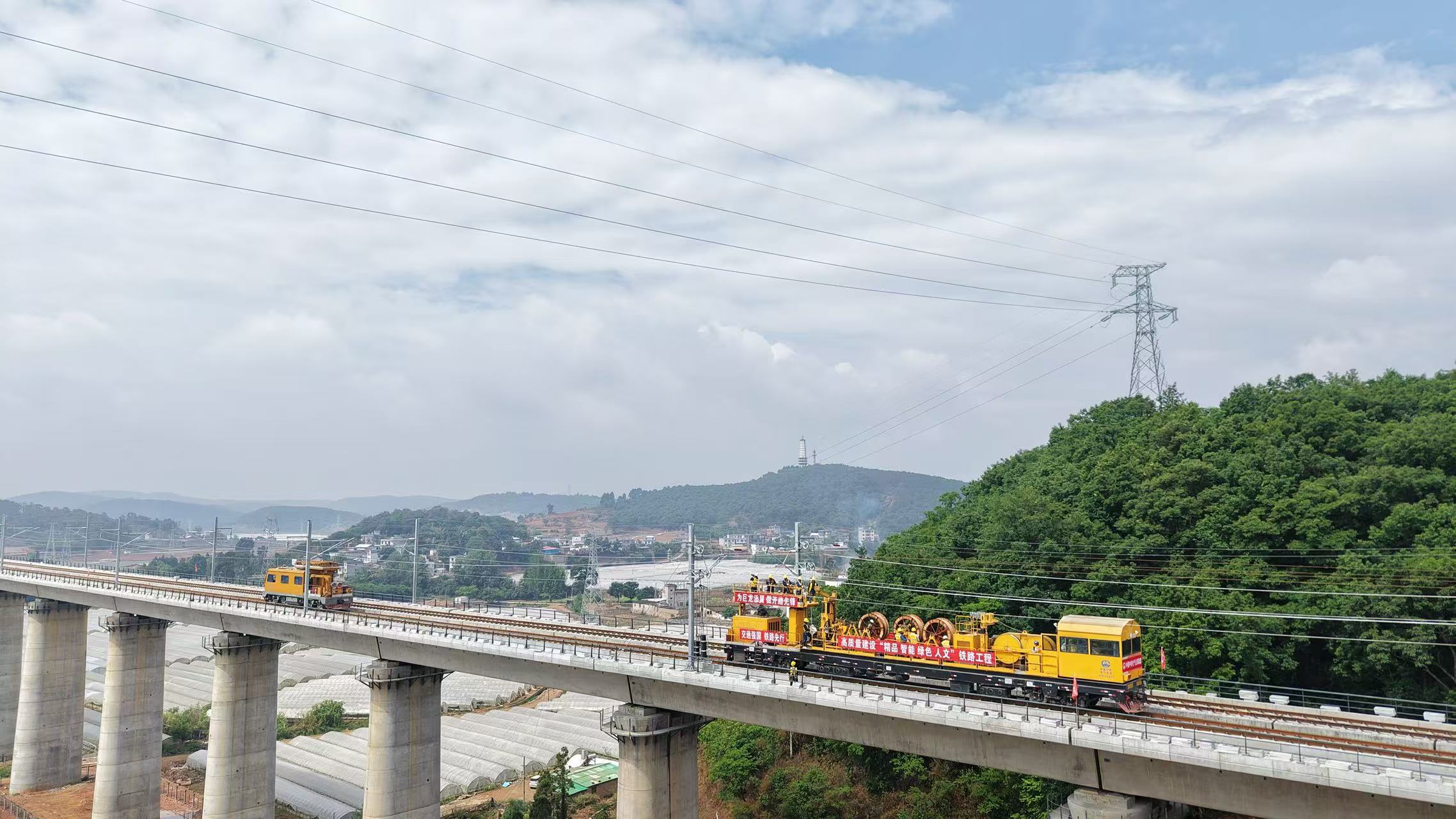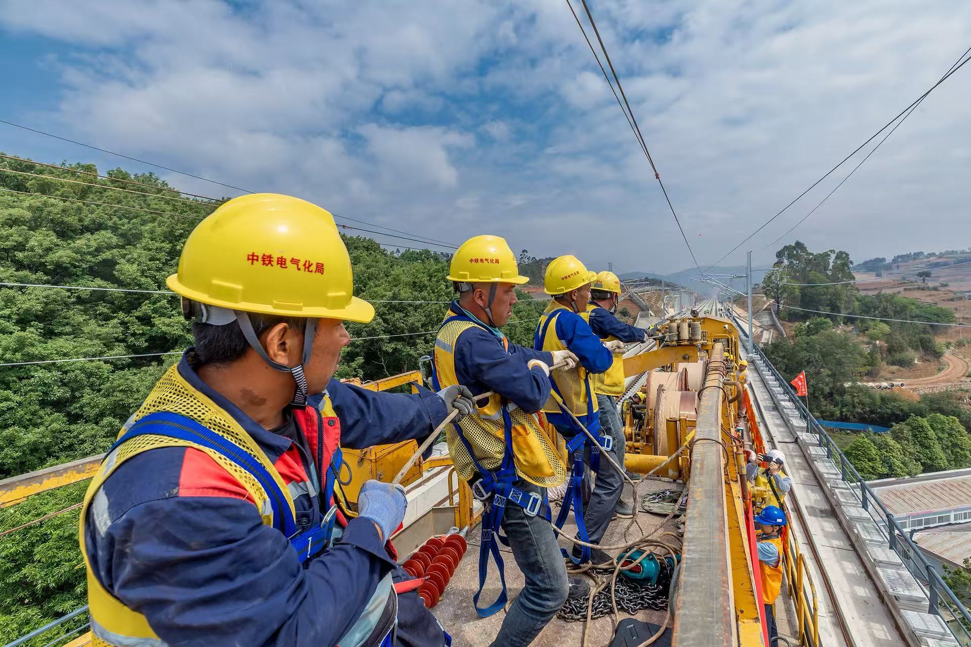“接触网导线作为高铁列车供电线路,直接影响列车供电与行车安全。渝昆高铁云南段接触网导线架设总任务量达1059条公里,需将导线平直度误差控制在0.1毫米以内。”中铁电气化局渝昆高铁四电项目部总工程师袁红旗认为,首条接触线的成功架设不仅验证了放线工艺在云贵高原复杂地形条件下的适应性,更为后续大规模导线架设作业提供了标准化施工范本。