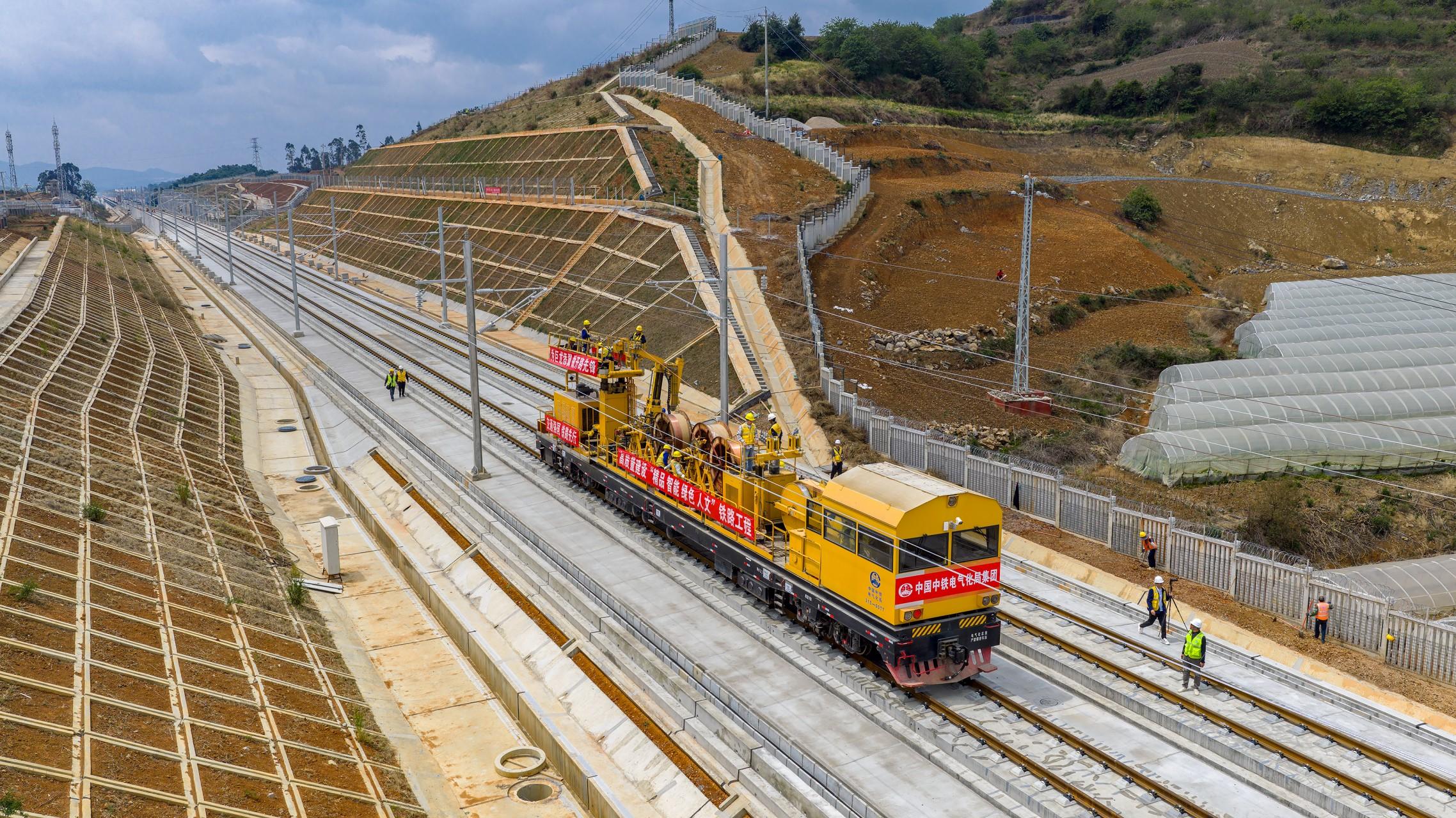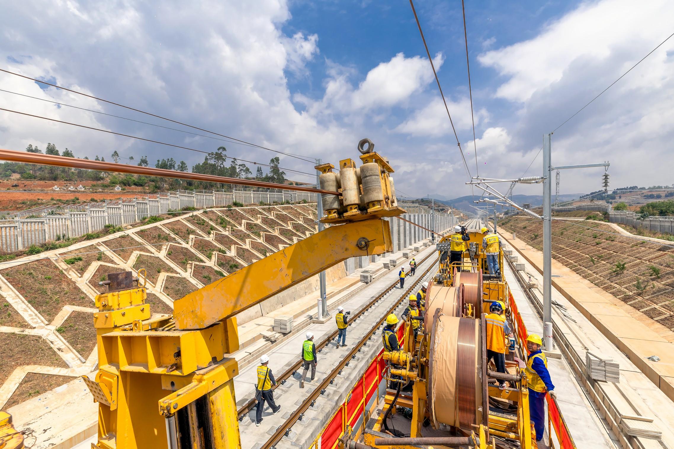 当天上午11时许,在云南省昆明市寻甸县,随着放线车平稳启动,经过45分钟的紧张作业,首条接触网导线精准架设到位。经现场技术人员复测确认,各项关键指标均符合设计要求,实现一次达标。