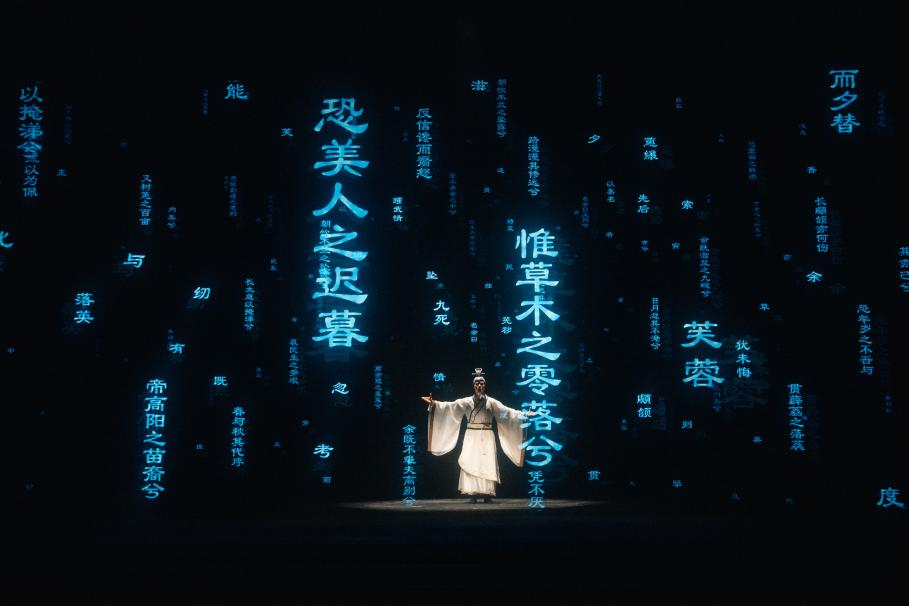 据悉,《屈原》是由多种高科技技术相结合的魔幻式舞台表演。该项目采用了大型全息AR技术,辅以旋转升降舞台、多块自动升降平台、单点吊等机械装置,结合后区大型立体式墙体投影等技术,营造如梦似幻的离骚幻想“诗”界,彰显鲜明荆楚文化特色与深厚中华优秀传统文化底蕴。