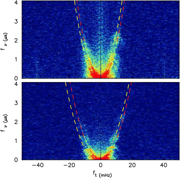 另一方面,结合FAST和位于澳大利亚的Parkes射电望远镜的观测,研究人员首次在其二次谱中发现了多层相邻的闪烁弧结构。进一步分析表明,这些闪烁弧很可能起源于该脉冲星星风云中天文单位尺度的电离结构。