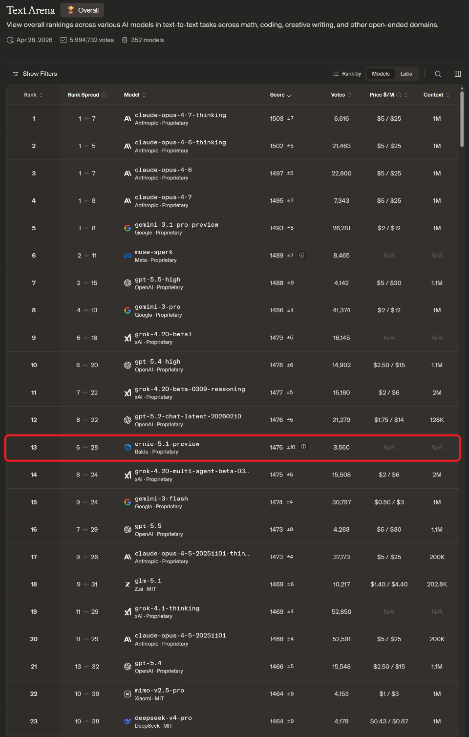 4月30日,LMArena大模型竞技场公布最新排名,文心5.1 Preview以1476分位列文本排行榜国内第一,超越GPT-5.5、DeepSeek-V4-Pro 等多款国内外主流模型,也是该榜单前十五名中唯一入围的中国模型。