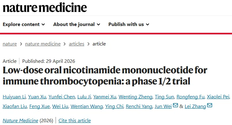 4月29日,中国医学科学院血液病医院(中国医学科学院血液学研究所)张磊、杨仁池、韦俊团队在《自然·医学》在线发表的研究论文显示,免疫性血小板减少症(ITP)患者补充β-烟酰胺单核苷酸(NMN),可恢复胞内烟酰胺腺嘌呤二核苷酸(NAD⁺)水平,重塑巨噬细胞功能,并降低血小板破坏。而且,低剂量口服NMN在早期临床试验中显示出良好的安全性和初步疗效。该研究为精准干预免疫性血小板减少症提供了新策略。