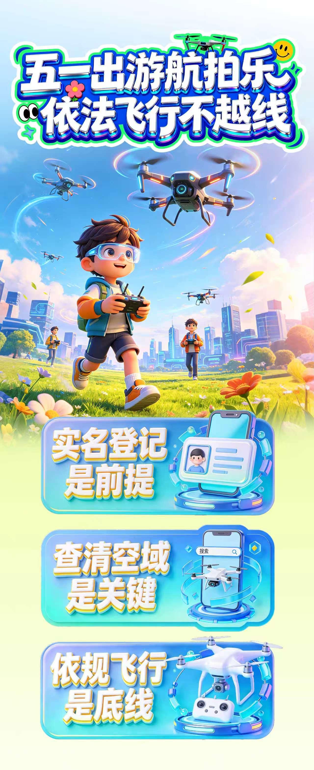 4月30日,公安机关发布无人机飞行活动安全提示。“五一”假期期间,无人机爱好者携机出游、航拍打卡,感受假日乐趣。为守护蓝天安全、远离违规风险,公安机关提示,实名登记是前提,查清空域是关键,依规飞行是底线。