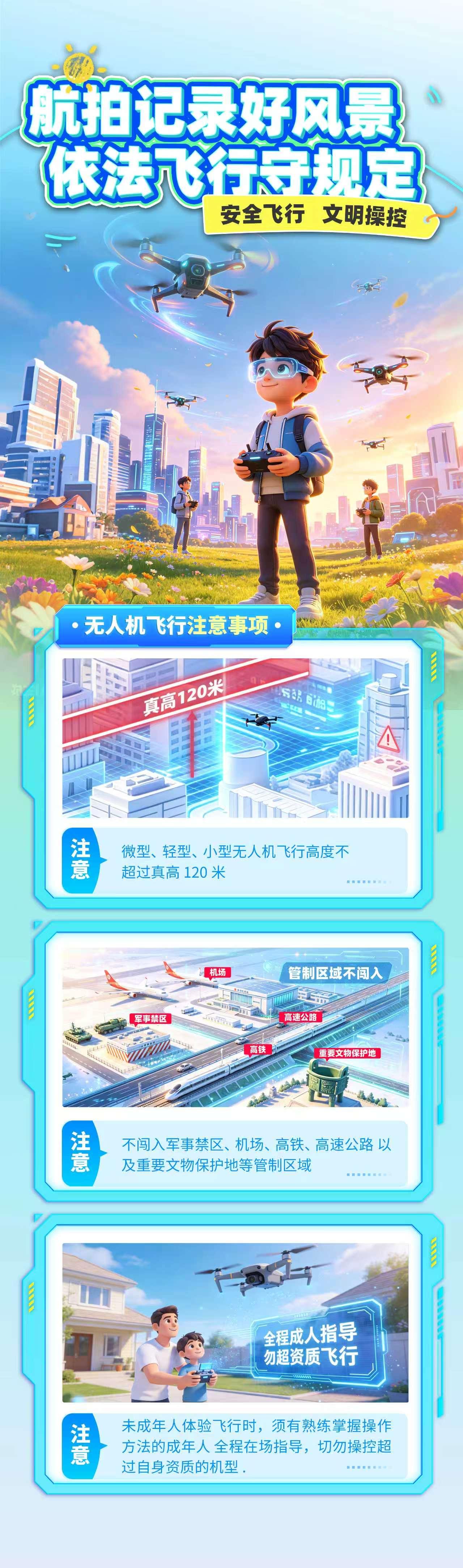 请自觉遵守无人机飞行管理相关法律法规,飞行前务必通过民用无人驾驶航空器综合管理平台(UOM平台)完成实名登记,并查询计划飞行区域的空域属性,确认无人机已完成实名登记且活动在适飞空域内。微型、轻型、小型无人机飞行高度不得超过真高120米,不得闯入军事禁区、机场、高铁、高速公路,及重要文物保护地等管制区域。未成年人体验飞行时,须有熟练掌握操作方法的成年人全程在场指导,切勿操控超过自身资质的机型。