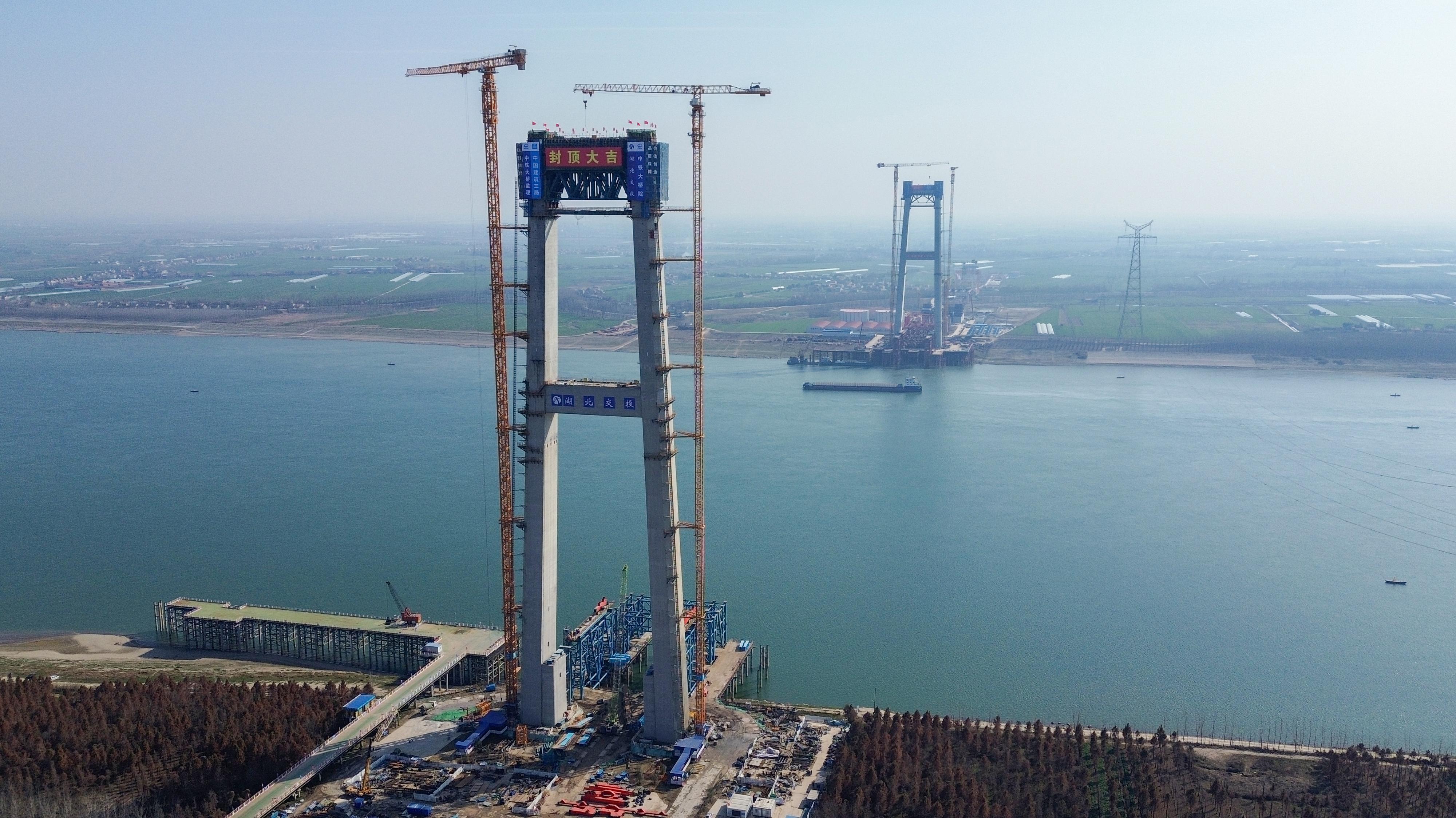 世界最大跨度公铁双层斜拉悬索协作大桥主塔封顶