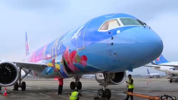 亮丽涂装展新颜 国产大飞机C919再添新航线