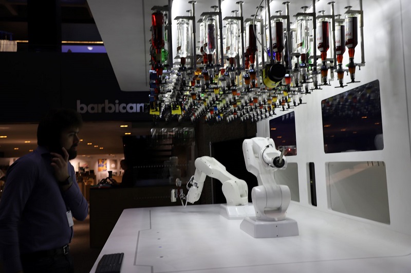 意大利公司研发的具有AI功能的鸡尾酒调配系统,该系统可以将158种酒类,按照消费者意愿进行自动调配。本报记者 田学科 摄