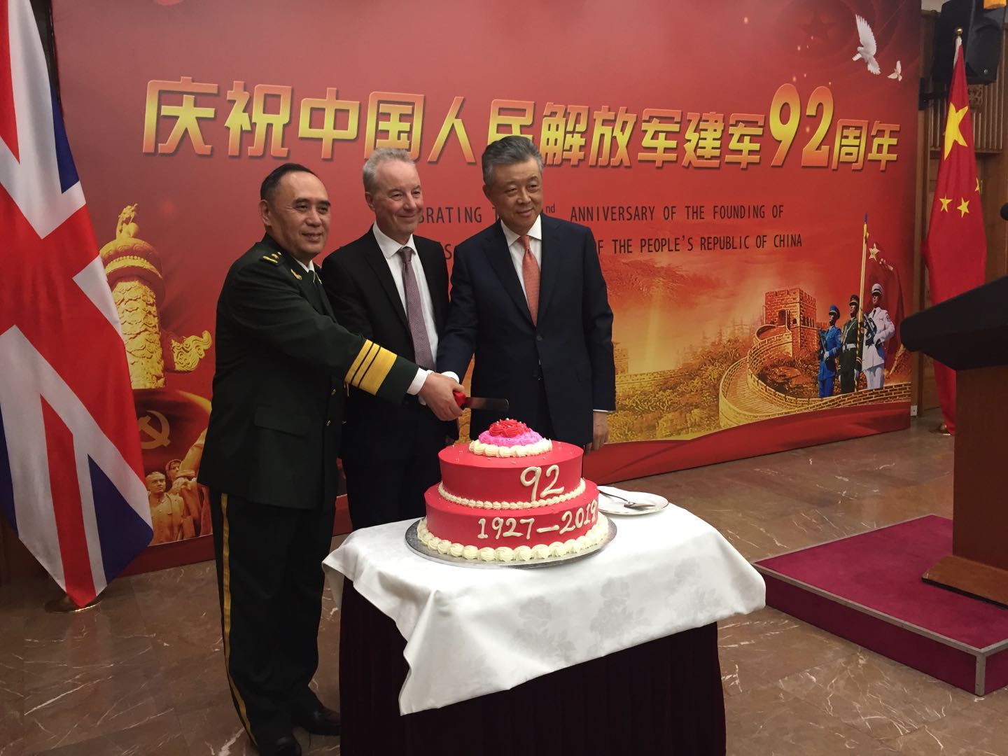 图二为刘晓明大使和苏广辉武官与英国国防部国际安全与政策局局长罗杰·赫顿博士共切具有象征意义的建军节生日蛋糕。