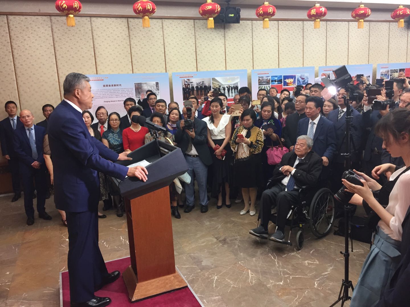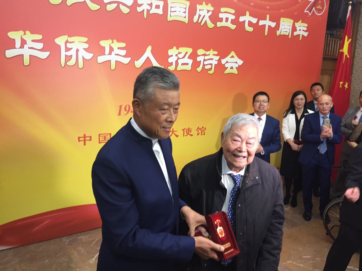 刘晓明大使向“庆祝中华人民共和国成立70周年纪念章”获得者、伦敦华埠商会创始人及永远名誉会长李志章颁发纪念章。(科技日报记者田学科摄)