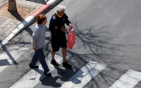 老年夫妇手提礼品袋过马路回家。 科技日报驻以色列记者 毛黎摄
