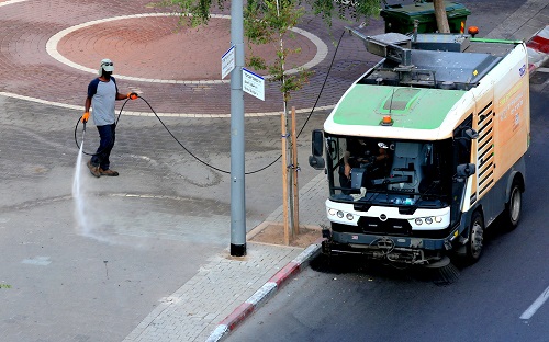 以色列特拉维夫市街道非常干净,离不开环卫工人的辛勤劳动。图为一名环卫工人用高压水枪将人行道上废物和树叶等冲到马路边,另一人开车将它们收集入车,使用高压水枪不仅效率高,而且不会扬起太多灰尘。 本报驻以色列记者 毛黎摄