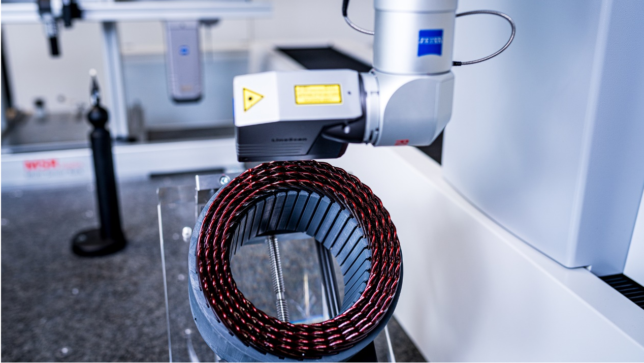 在电机方面,从保时捷开始,主机厂相继布局基于800V电压平台的新车,通用、大众、奔驰、现代、比亚迪、广汽埃安、吉利极氪、北汽极狐、小鹏汽车等均有所动作。不断提高的电机转速对于电机旋转类零件提出超高的精度要求,新一代电机带来的挑战涉及发卡和定子的精准生产和装配,以及定子和转子中叠片的制造。蔡司生产接触式和光学测量设备,涵盖质量管理过程的各个方面,可以帮助电机制造商建立整个检测链。比如用传统三坐标配上激光测头测量现在最流行的发卡电机,对里面的扁铜线进行检测。
