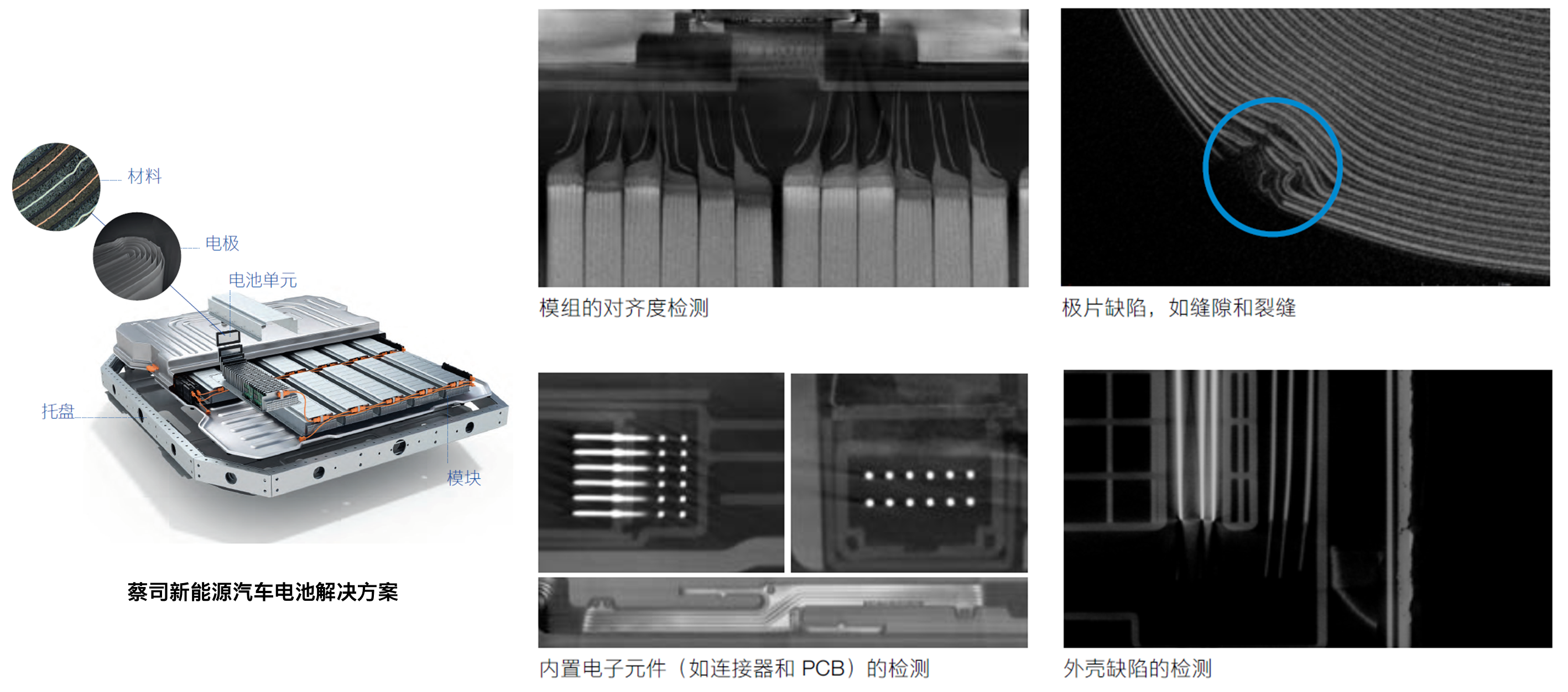 例如在材料研发环节,电芯材料的微观结构将决定电池的性能,需要各种分析解决方案来了解材料和电池性能之间的关系。蔡司以光学显微镜、聚焦离子束扫描电子显微镜以及用于无损3D成像的X射线显微镜构成表征材料微观结构、化学成分和电气特性所需的解决方案,这些解决方案相互关联,从而能分析出局部属性对整体性能的影响。在电芯生产环节,无损CT检测助力电池厂商找到电池发热、失效及短路等根本原因,从源头避免缺陷电芯流入市场。在模组装配环节,无损CT检测是新能源汽车电池模组装配的必要步骤,CT扫描必须能够分析到微米级金属颗粒以及微米级缺陷,以确保装配质量和进行失效分析。蔡司微焦点 X 射线管能以高分辨率和高效率对电池及其模组进行更好的CT成像,X射线光学技术和机电一体化技术的结合保证了电池及其模组检测的精确性、机器的稳定性和操作的可靠性。