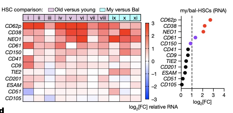 衰老与造血干细胞(HSC)的一种变化有关,HSC能产生各种类型的血细胞。年轻的HSC能平衡产出淋巴细胞和髓系细胞(在免疫应答中有作用的两种不同白细胞系),但髓系细胞的产生会随年龄而增加。这种改变被认为是免疫系统年龄相关变化的原因,免疫系统的年龄相关变化包括适应性免疫下降和炎症增加。