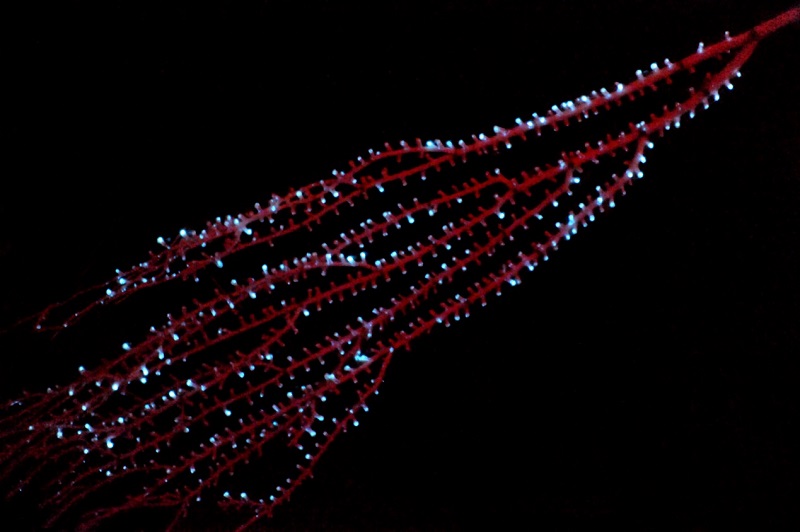 八放珊瑚是一种进化史古老且经常发光的动物群,包括软珊瑚、海扇和海笔。和硬珊瑚一样,八放珊瑚是微小的群居水螅体,它们分泌出一种物质结构来作为“避难所”。但与它们的石质亲戚不同的是,这种结构通常是软的。八放珊瑚通常只有在受到碰撞或其他干扰时才会发光。