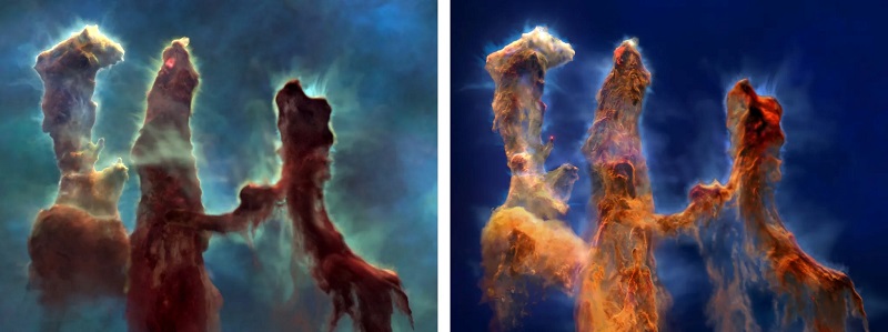 左图为哈勃版本:柱子呈深棕色,具有不透明尘埃和亮黄色电离气体,背景为蓝绿色;右图为韦伯版本:柱子鲜亮清晰,具有半透明橙棕色尘埃和浅蓝色电离气体,背景为深蓝色。