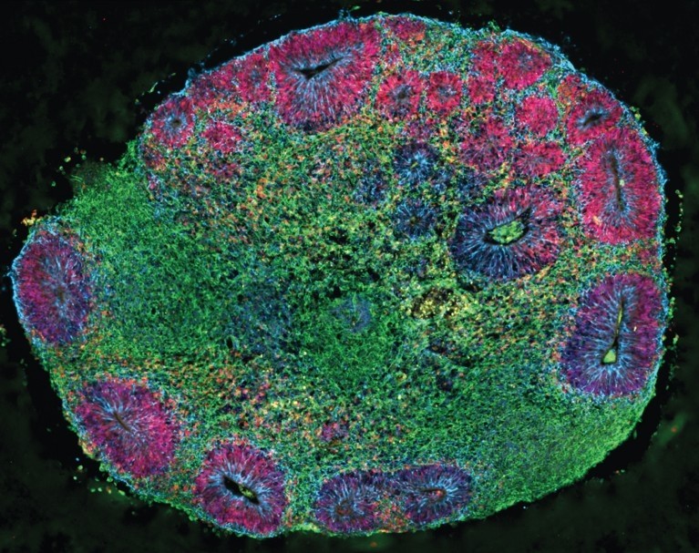 在最新研究中,哈佛大学的葆拉·阿洛塔等人解决了这一难题。她解释说,诀窍是首先制作一组单一供体类器官。随着这些细胞不断成熟,所有类器官中的细胞都具有相似的生长速度。然后,她们将这些结构均匀混合在一起,培育出复合类器官。生长3个月后,这些嵌合体膨胀到约3—5毫米,并且包含的细胞类型与胎儿皮层组织中的细胞类型相同。