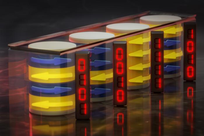 信息存储在位于圆柱畴及其周围环境之间的畴壁中。畴壁的这种磁化可顺时针或逆时针指向各个块,这些块由钌层垂直隔开。通过系统地改变这些方向,研究人员可在圆柱域内编码不同的比特序列,图示为概念解释。