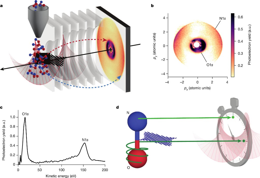 在最新研究中,研究人员使用SLAC的直线加速器相干光源发出的阿秒(100亿亿分之一秒)X射线脉冲,电离核心级电子,将电子从分子中“踢出”。然后,他们使用单独的激光脉冲,根据电子发射的时间,将其“踢向”略微不同的方向,以测量光电发射延迟时间。
