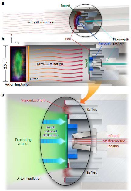 研究团队在此次在实验中测试了如何模拟一个核装置撞击小行星的效果。他们用X射线靶向真空中两个12毫米宽的模拟小行星(一个由石英组成,另一个由熔融石英组成),X射线脉冲能加热小行星类似物的表面,生成的蒸汽羽流将推力分别转移给石英和熔融石英目标体,产生了约每秒69.5米和每秒70.3米的速度。