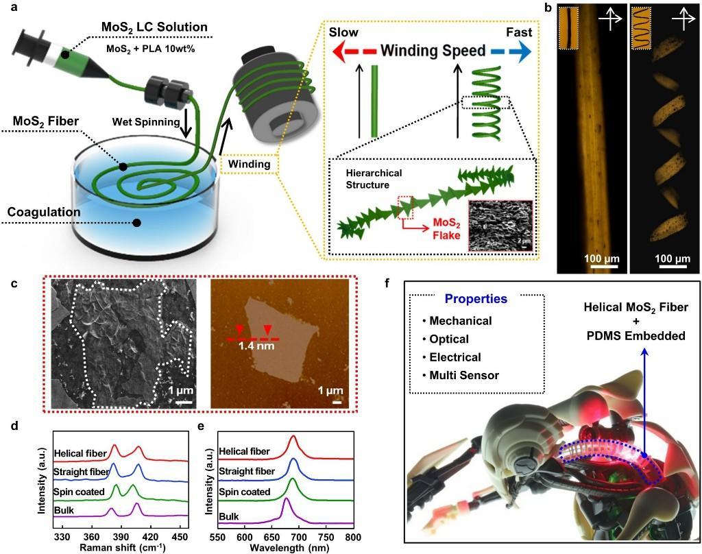 研究团队采用基于二硫化钼的特殊制造工艺,打造出了可以自由调整为三维形状的纤维。二硫化钼具备优异的机电性能,结合纤维内独特的结构,所制备的新型纤维不仅性能出众,更展现出感知各类环境信息的巨大潜力。在此基础上,他们研制出了这款多功能传感器。
