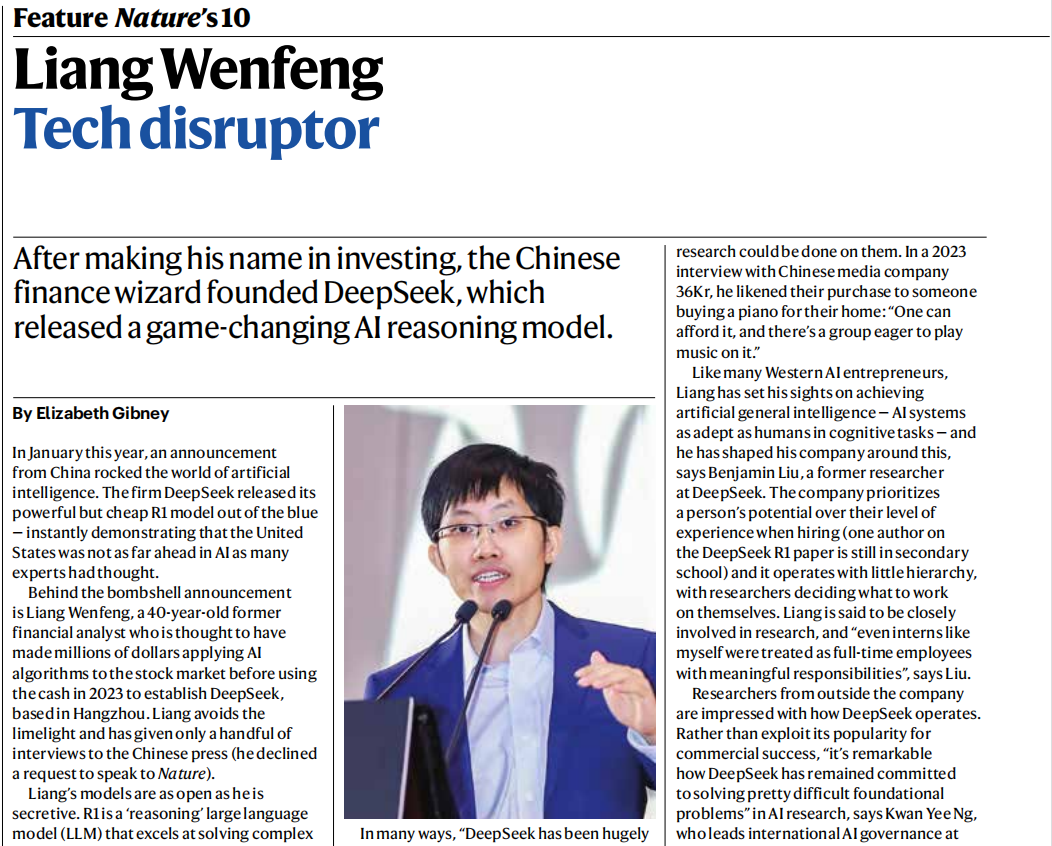 《自然》介绍称,2025年是科学家拓展知识边界的一年,也是颠覆的一年。中国企业家梁文锋1月推出的DeepSeek惊艳了日新月异的AI界,这个大语言模型的表现媲美现有最先进模型,但构建资源仅需后者的一小部分,与此同时,DeepSeek以“开放权重”(直接发布模型训练后的参数权重而无需重新训练)的形式公开,意味着它能免费下载并扩展,为科研人士带来福音。