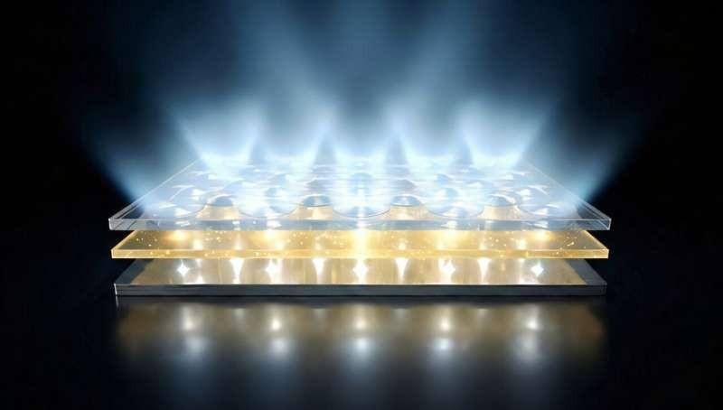 更关键的是,团队发明了一种新型近平面光输出耦合结构。这种结构厚度极低,与现有微透镜阵列相当,几乎不增加器件高度,却能达到接近半球形透镜的光提取效果。它能高效引导光线向前射出,避免过度扩散,从而在不牺牲视角的前提下大幅提升亮度。