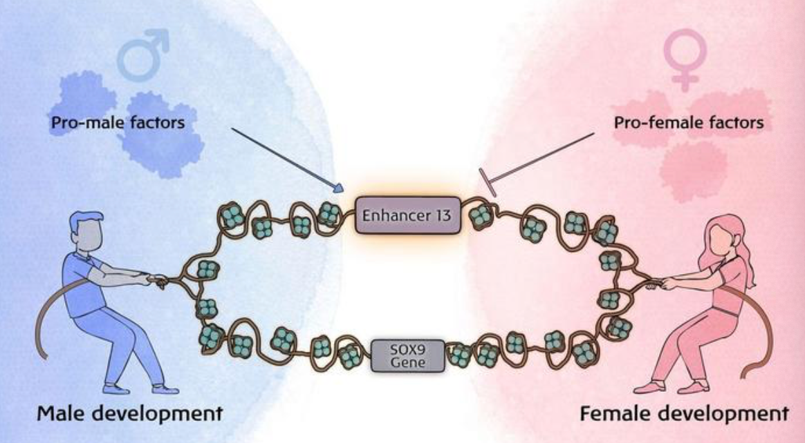 此次发现的焦点是一个名为Enh13的调控元件。它的功能是调控对睾丸发育至关重要的Sox9基因。在正常的性发育过程中,Sox9基因的活性如同一道关键闸门:在雄性(XY)个体中,需要被激活以启动睾丸发育程序;而在雌性(XX)个体中,它必须被严格关闭,方能保证卵巢的正常形成。