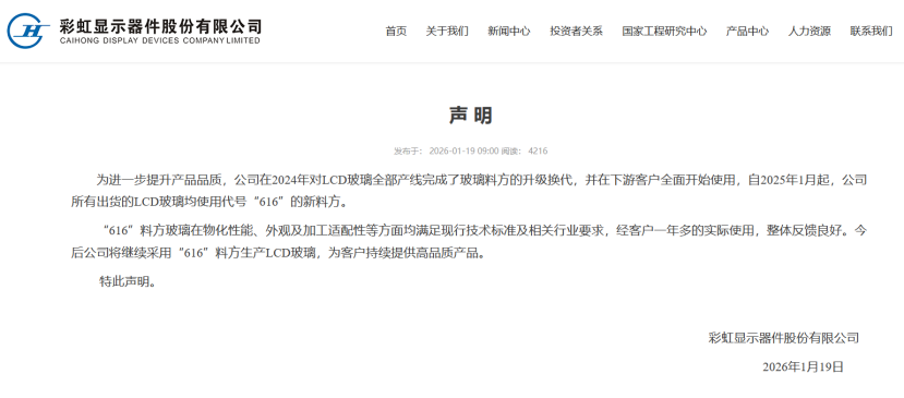 据了解,彩虹股份已于2024年全面完成LCD玻璃产线料方技术升级,并自2025年1月起全面采用“616”料方进行产品出货。