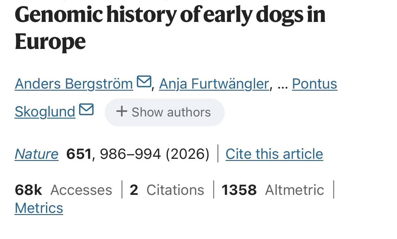 《自然》杂志近期发表的两项研究显示,至少在14200年前,家犬已在欧亚大陆西部广泛分布。这组论文报告了迄今已知最古老的犬类基因组,早于此前约10900年前的遗传记录。