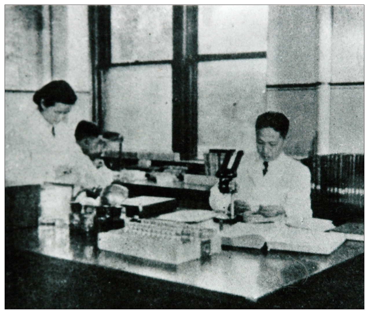 图. 昆虫学专家陈世骧博士与其助手龚韵清在实验室内研究美机所投昆虫的情形