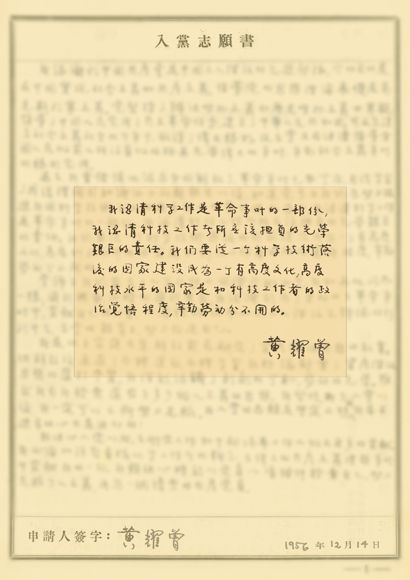 我认清科学工作是革命事业的一部分,我认清科技工作者所应该担负的光荣艰巨的责任。我们要从一个科学技术落后的国家建设成为一个有高度文化、高度科技水平的国家是和科技工作者的政治觉悟程度、辛勤劳动分不开的。