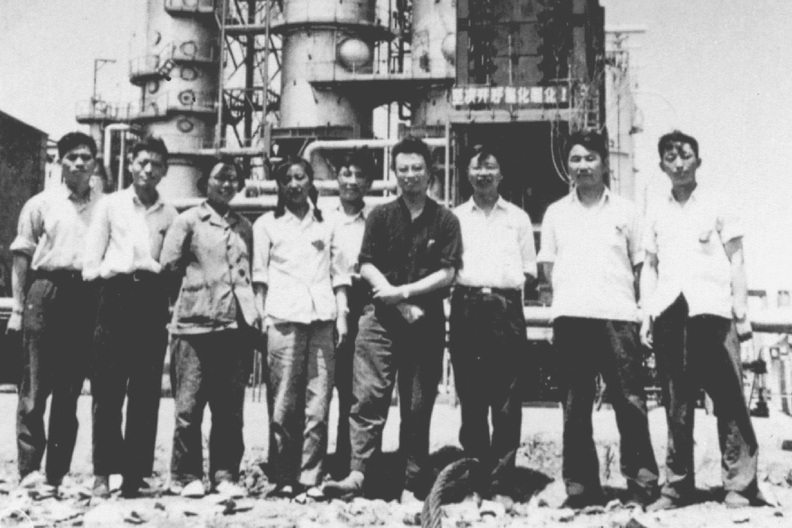 1965年,陈俊武(右三)在抚顺石油二厂催化裂化装置前
