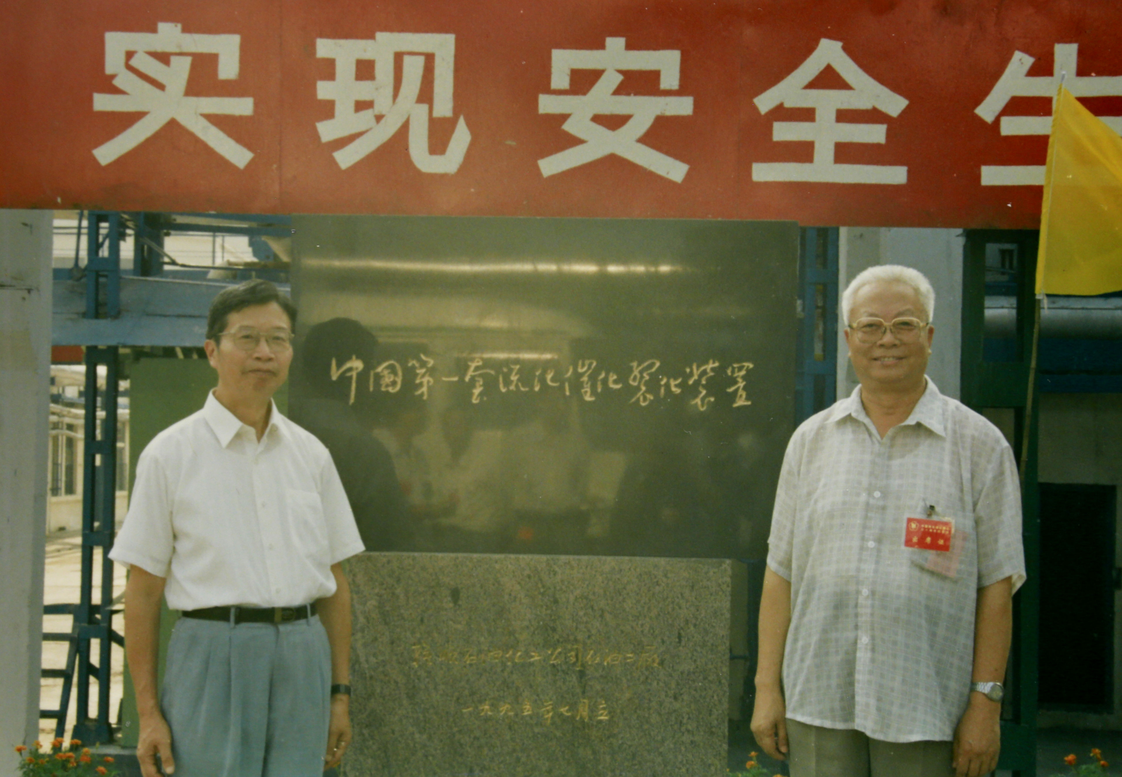 1961年冬,34岁的陈俊武受命担任我国第一套流化催化裂化装置的设计师。图为陈俊武(左)与当年的副设计师张福诒在“第一朵金花”纪念碑前留影
