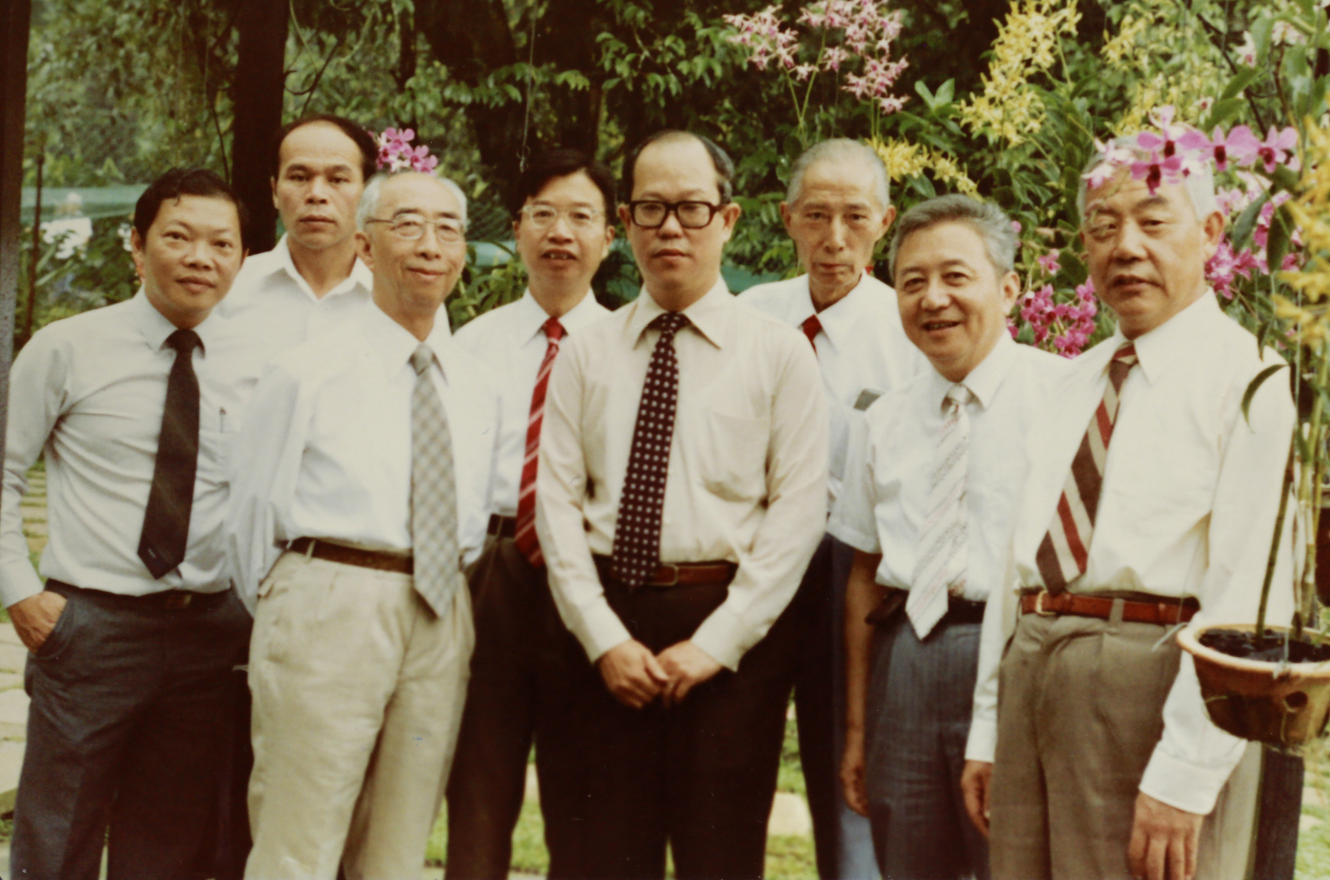 1983年8月,陈俊武(左四)赴伦敦参加第11届世界石油大会,与侯祥麟、朱康复、闵恩泽、朱亚杰等合影